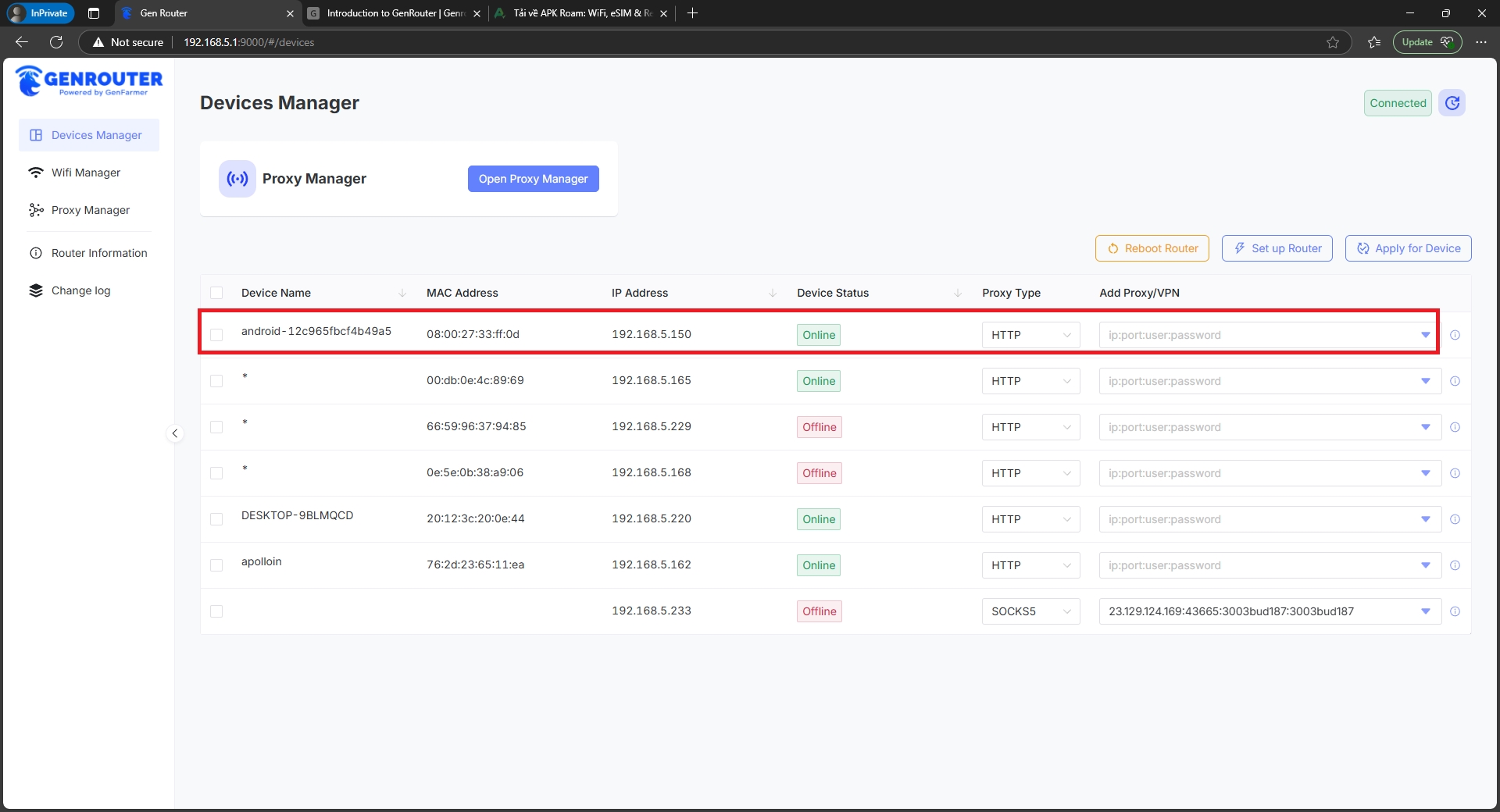 Check that the IP address matches the one in GenRouter (e.g., 192.168.5.1:9000).